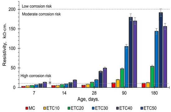 Electrical resistivity tests were carried out on the six concrete mixtures MC, ETC-10, ETC-20, ETC-30, ETC-40 and ETC-50. Electrical resistivity is considered a very important physical property to determine the quality and durability of concrete [57,58]. Several investigations have shown that the level of corrosion or resistance to corrosion of reinforcing steel in concrete exposed to aggressive media can be determined by electrical resistivity [59,60].