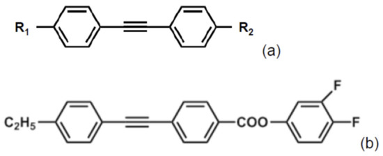 (a) Molecule sketch of a general tolane-type liquid crystal and (b) TE-2FF.