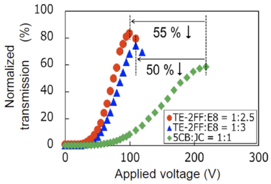 We observed the Kerr effect of our new material and conventional, non-tolane 5CB:JC1041XX material, as shown in Figure 4. JC1041XX was available from JNC, Tokyo, Japan. Light transmission was observed with the crossed-Nicol polarized microscope. All the curves seem proportional to the square of sinusoidal function except at the voltage of lower than 40 V, in which case, they reach their peaks, and then decrease. We should note that the voltage at the peak transmission is 216 V for the conventional mixture while we find 97 and 108 V for our new mixture with TE-2FF:E8 ratios of 1:2.5 and 1:3. These new data shows that reduction of the applied voltage is as high as 55 and 50%.