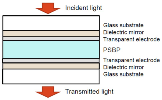 A cross-sectional schematic of the WSF is shown in Figure 5. A test cell of WSF was developed as follows: On two glass substrates, we deposited a dielectric mirror of six-pair layers of silicon oxide and titan oxide as high and low refractive index material, respectively, and a layer of indium tin oxide as transparent electrode that was placed inside the mirrors. Each layer of silicon oxide and titan oxide has a thickness (optical length) of quarter of the wavelength of 1.5 µm. We designed the cells, assuming that refractive index of titan oxide is 2.2 and that of silicon oxide is 1.4. The two glass substrates were fixed with 10 µm thick spacers and adhesive, which are not shown in Figure 5 to omit complexity. The precursor mixture was injected into a Fabry–Perot etalon at 110 °C for the TE-2FF:E8 ratio of 1:1 and 1:2 and at 95 °C for the ratio of 1:2.5, 1:3, and 1:4. Then, the cell was irradiated with 365 nm and 1.5 mW/cm2 UV light for 20 min to be polymer-stabilized in the etalon. Finally, we sealed the cell and bonded electric wires for measurements. The PSBP thickness was estimated to be larger than the spacer thickness of 10 µm and its refractive index was approximately 1.4.