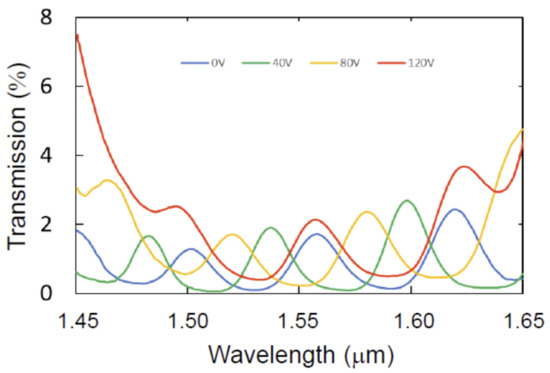 To test the cells, we employed an optical spectrum analyzer with a built-in broadband light source. Light from the light source was fed through a single-mode optical fiber to be a parallel beam after passing through a focusing lens. The light beam was incident on the cell and concentrated and fed into the optical spectrum analyzer with another lens and another single-mode optical fiber. The measurement configuration was setup in a box so that the optical measurement was measured stably. No matching oil was employed in the setup. Figure 6 shows measured transmission spectra of the developed device at the applied voltages of 0 (blue), 40 (green), 80 (yellow), and 120 (red) V. The applied electric signal was alternative current at an audio frequency. The light was not polarized and the temperature was 27 °C. We evaluated only the cell with the TE-2FF:E8 of 1:4. At 0 V, the spectrum shows a curve similar to the square of sinusoidal function. The peak transmission wavelength decreases clearly as the applied voltage increases. The developed device functioned successfully as a WSF; however, the maximum transmission is as low as 2.2% and the half-bandwidth is 23 nm. The low transmission suggests that absorption may occur in the etalon, which will be discussed in Section 4.