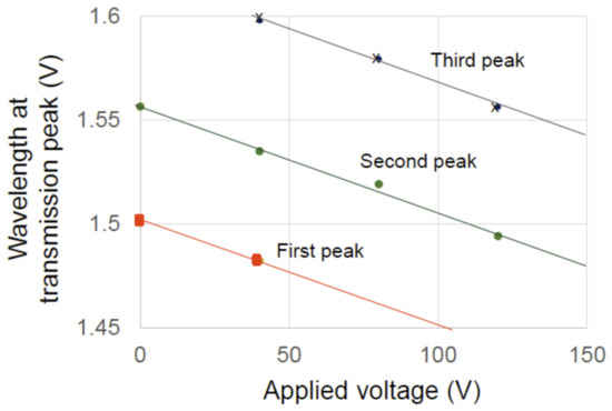 Wavelength at transmission versus the applied voltage. Data for three peaks are plotted.