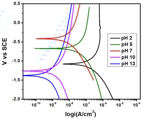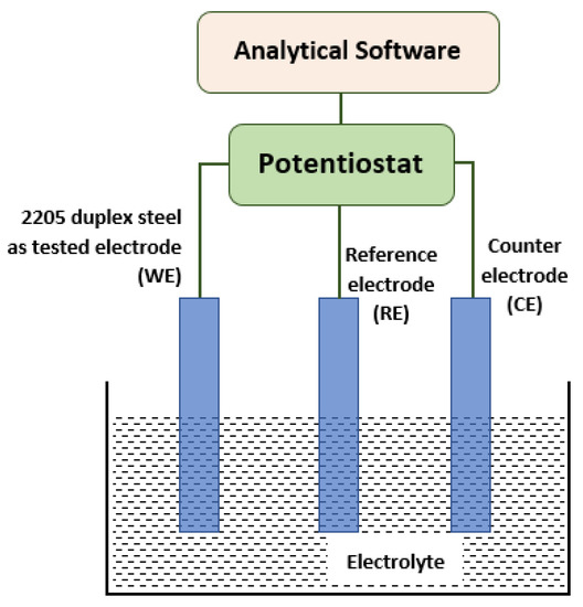 - Luo, H.; Dong, C.F.; Li, X.G.; Xiao, K. The electrochemical behaviour of 2205 duplex stainless steel in alkaline solutions with different pH in the presence of chloride. Electrochim. Acta 2012, 64, 211–220. [Google Scholar] [CrossRef]