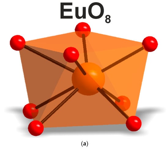 - Yamamoto, H.; Seki, S.; Ishiba, T. The Eu site symmetry in AEu(MoO4)2 (A= Cs or Rb) generating saturated red luminescence. J. Solid State Chem. 1991, 94, 396–403. [Google Scholar] [CrossRef]