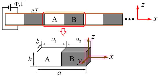 As shown in Figure 1, consider a MEE-PC beam that continues indefinitely along the x-axis with a uniform rectangular cross section. The unit cell consists of two perfect bonded beams of material A with length and material B with length , and the lattice constant . The MEE-PC beam is subjected to applied z-axis polarized electric potential , magnetic potential and a uniform temperature change .