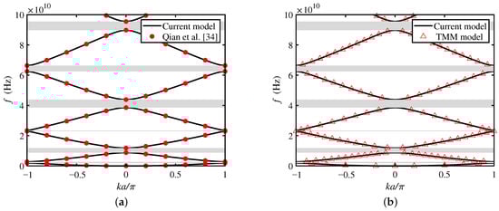 To verify the correctness of the current model provided from Section 2, an example in comparison with another study was carried out. The geometric and physical parameters of the model in this section are adopted from Qian et al. [34]. The specific bandgaps of the current model are gained by suppressing the microstructure and piezomagnetic effects of the model (i.e., setting in Section 2), as shown in Figure 2a,b. For the convenience of comparison, bandgaps without a size effect (i.e., not applying nonlocal theory) provided by Qian et al. [34] are also plotted in Figure 2a. It is shown that bandgaps predicted by the current model without microstructure and piezomagnetic effects are in good agreement with those by Qian et al. [34]. In addition, to validate the PWE method in the current model, the bandgaps predicted by the transfer matrix method (TMM) with the same conditions have also been plotted in Figure 2b. Note that the TMM method has been successfully proved to predict bandgaps in the multifield PC beams at macron scale [52,53,54]. It can be observed that the numerical results of both the PWE and TMM methods are the same.