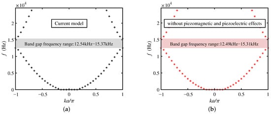 Bandgaps of the current model (a) with and (b) without piezomagnetic and piezoelectric effects.