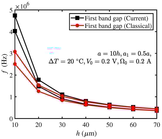 The geometric parameters of the PC microbeams in this section are , , the beam thickness h varies from 10 μm to 70 μm, and other parameters are °C, , . The bandgap (i.e., black square line) predicted by the current model is shown in Figure 4. For comparison purposes, the bandgap (i.e., red circular line) predicted by the classical model (i.e., eliminating the microstructure effect) is also plotted in Figure 4.
