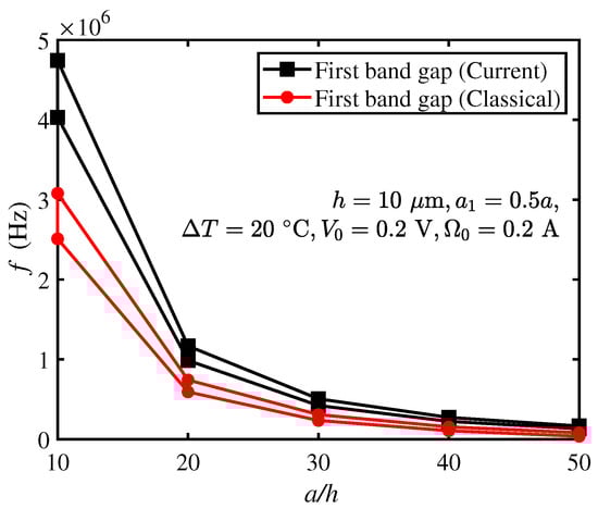 From Figure 7a, it is seen that the bandgap size of the current model gradually increases with the increase in applied electric potential when the beam size is small (with μm here), while the frequency decreases. The bandgap of the classical model has a similar trend. In addition, the bandgap frequency of the current model is always higher than that of the classical model, which is consistent with the conclusion in previous sections.