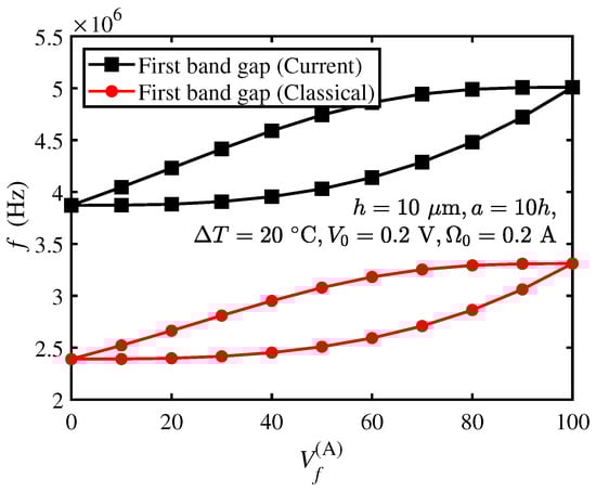 In Figure 6, the bandgap of the current and classical models varies with which is defined as the volume fraction of material A () (i.e., ), and values of the bandgap are provided in Figure 6 and Table 2. The geometric parameters are μm, , and the other parameters are the same as those in Section 3.3.