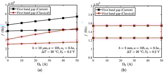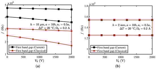 This section shows the bandgap can be adjusted through the external electric potential of the current and classical models. The external electric potential varies from 0 to 2000 V, and the beam thickness μm in Figure 7a, while mm in Figure 7b. The remaining parameters are fixed as those in Section 3.3 (i.e., , , °C, ).