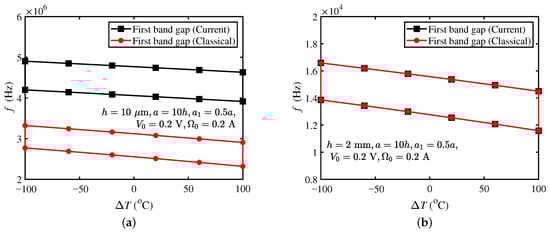 From Figure 9a, with the increase in , the bandgap frequency of the two models decreases. From Figure 9b, the variation trend of the bandgap is like that for μm. In addition, Figure 9b shows that in the case of mm, the bandgap size of the current model is the same as that of the classical model. From Figure 9, it indicates that the effect of temperature on bandgaps is present at all length scales.