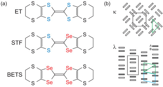 Strongly correlated electron systems attract much interest due to some novel magnetic, dielectric, and superconducting properties; both electron–electron interactions and quantum fluctuations are considered crucial for understanding these phenomena. Among these systems, the quasi-two-dimensional organic charge-transfer salts are renowned for their versatility and enormously rich phase diagrams, comprising superconducting, spin-liquid, antiferromagnetic, or charge-ordered phases that arise from the interplay of spin, charge, and lattice degrees of freedom [1,2,3,4,5]. Besides the most popular examples -(BEDT-TTF)X, another dimerized family has drawn large attention, the -salts, where the lattice system consists of triangular and square tiling as depicted in Figure 1b. In addition to the well-studied unconventional superconducting properties, such as a Fulde–Ferrell–Larkin–Ovchinnikov state and field-induced superconductivity at strong magnetic fields [6,7,8,9], a spin-liquid-like state was discovered recently [10,11].
