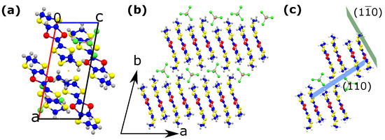 Single crystals of -(BEDT-STF)GaCl were synthesized at Hokkaido University by the standard electrochemical oxidation method [39]. In contrast to BEDT-TTF molecules, in BEDT-STF, two central sulfur atoms are substituted by Se atoms, leading to asymmetric BEDT-STF molecules as sketched in Figure 1a. The crystals have a needle-like shape parallel to the c-axis and typical dimensions of 1 mm × 0.2 mm × 0.05 mm. The donor molecules are dimerized with the pairs arranged in the ac-plane. As shown in Figure 2, the conducting layers of donor molecules alternate with insulating anion sheets along the b-axis, giving rise to a quasi-two-dimensional structure. The morphology of the crystals corresponds to the , , and -planes. For clarity and planes are depicted in Figure 2c, while the -plane coincides with the c-axis.