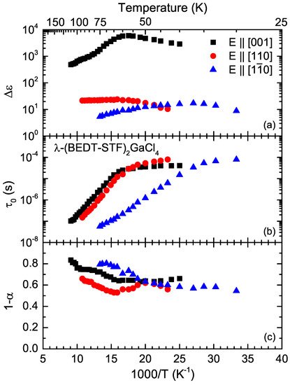 The temperature dependence of the parameters of -(BEDT-STF)GaCl extracted from the fit of the data by Equation (2) is plotted in Figure 5 as a function of inverse temperature . The dielectric strength exhibits a broad peak around K for the electric field oriented within the -plane and around K for the out of plane direction, . This behavior resembles the temperature dependence of for low frequencies. At high temperatures, the mean relaxation time shows thermally activated behavior for all three directions; at the same time, the symmetric broadening decreases with decreasing temperature. These features are signatures of cooperative behavior and glass-like freezing of molecular motion [48].
