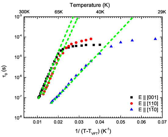 In Figure 6, the mean relaxation time of -(BEDT-STF)GaCl is plotted for all three orientations as a function of together with fits by Equation (3). The Vogel–Fulcher–Tammann law explains how the peak seen in the temperature-dependent plot of Figure 3 shifts with frequency. The parameters of the mean relaxation time obtained by the fits are listed in Table 1 for the different axes. We also see that is equal to 15 K for all three directions; the value is slightly higher than K, extracted for the spin liquid candidate -(BEDT-TTF)Cu(CN), adjusted to the anomaly observed in numerous other quantities [44].