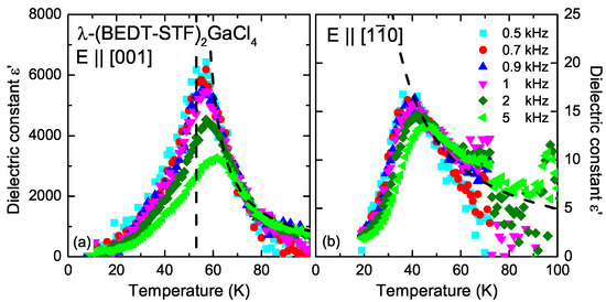 For the orientations and , broad maxima develop below K, which are strongly frequency dependent. With decreasing frequency, the peak shifts toward lower temperatures and becomes sharper. For , a clear step can be seen in the real part of the dielectric constant around K that shifts toward higher temperatures with increasing frequency. This behavior is typical for relaxor ferroelectrics, and similar dielectric anomalies are frequently observed in organic conductors [19,20,21,43,44].