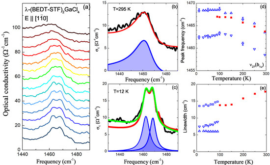 (a) Temperature evolution of the optical conductivity of -(BEDT-STF)GaCl in the region of the molecular vibration (b). The data are shifted with respect to each other by a constant offset for clarity reasons. (b,c) Fits of the vibrational mode at and 12 K. The experimental data are shown in black, the red lines correspond to the overall fit, and the blue lines are separate contributions to the mode. From the two-state jump model [Equation (7)], we obtain the green line. (d,e) Temperature dependence of the resonance frequency and linewidth of the charge-sensitive mode (b). While the red squares correspond to the fit by a single contribution for K, the blue symbols represent the two-mode description, where triangles and rotated triangles are related to different Lorentzians; the open blue squares in panel (e) correspond to the sum of both, demonstrating that the overall width does not change.