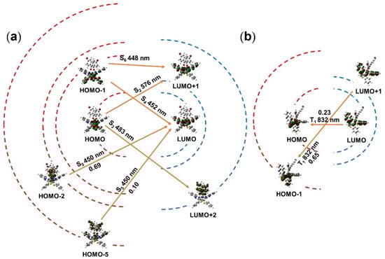 | S5 | 450 | 0.0185 | HOMO − 5→LUMO (0.10) HOMO − 2→LUMO (0.69) | MLCT/LLCT MLCT/LLCT |
