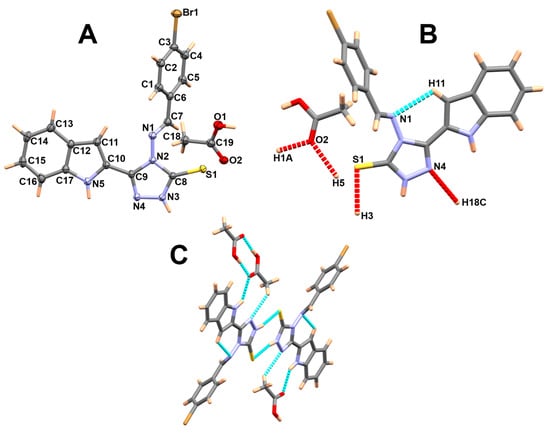 Compound 3 crystallized in the triclinic system and space group with unit cell parameters of a = 5.9989(2) Å, b = 12.1234(5) Å, c = 13.6872(7) Å, α= 74.972(4)°, β=81.734(4)° and γ = 83.213(3)°. The unit cell volume is 947.98(7) Å3 and the number of molecules per unit cell is 2, and one molecule per asymmetric unit. Selected bond distances and angles are listed in Table 2. The asymmetric unit comprised one molecule of compound 3 and one acetic acid molecule (Figure 1A). In this compound, the indole and the triazole rings are almost coplanar. The tilt angle between the planes passing through these moieties is found to be 1.64(12)°. In contrast, the 4-bromo-phenyl moiety and the triazole rings are significantly twisted from one another by 59.51(14)°.