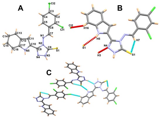 Structure of the asymmetric unit with atomic numbering and thermal ellipsoids drawn at 30% probability (A), most important hydrogen bond contacts (B) and hydrogen bonding interactions (C) in 3.