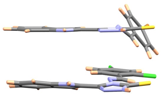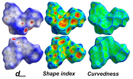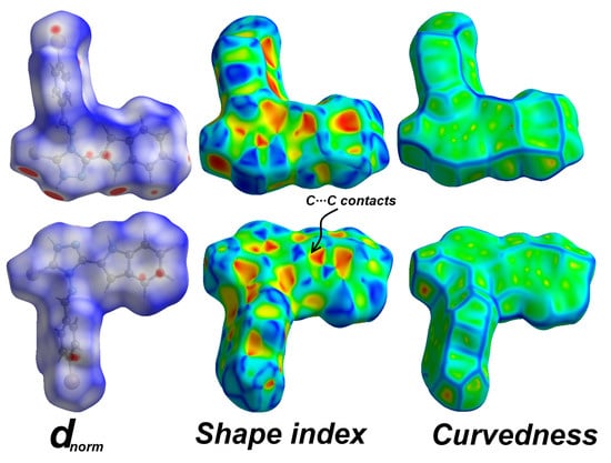 Also, the presence of some short C···C contacts (5.2%) related to the aromatic π-system revealed the presence of π–π stacking interactions. This fact was further confirmed by the presence of large green flat area in the curvedness and the complementary red/blue triangles in the shape index (Figure 4).