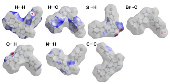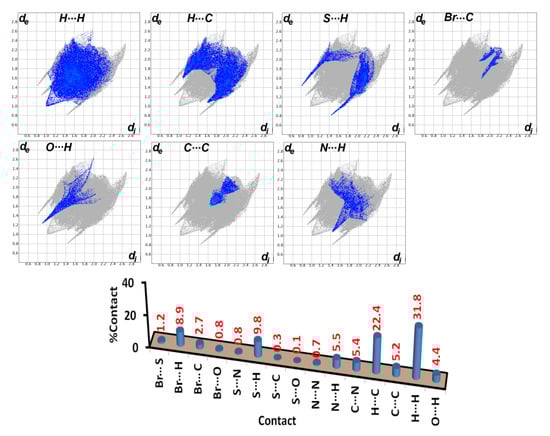 Decomposition of the fingerprint plot gave the percentages of all intermolecular contacts in the crystal. The percentages of all possible intermolecular interactions and the decomposed fingerprint plots of the short contacts are presented in Figure 5. It is clear that the H···H (31.8%), H···C (22.4%), S···H (9.8%) and Br···H (8.9%) contacts are the most dominant. In addition, there are some significant contributions from the N···H (5.5%), C···N (5.4%), C···C (5.2%) and O···H (4.4%) contacts.