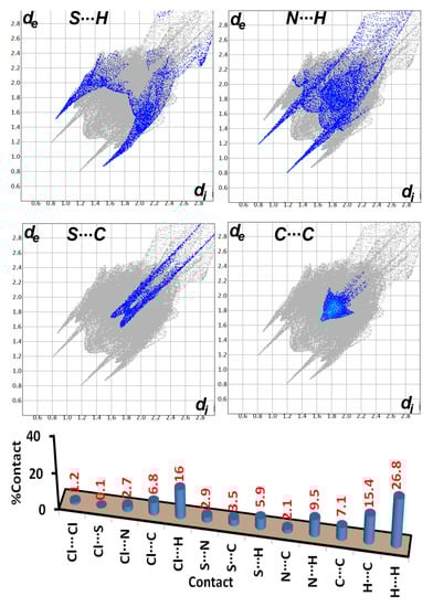 For compound 4, the dnorm, shape index and curvedness maps are presented in Figure 7. In addition, there are a large number of red spots in dnorm map indicating the presence of short contacts which are important for the molecular packing and the crystal stability. These contacts were further analyzed using the fingerprint plot, and their percentages were calculated. The results of decomposed fingerprint plots are depicted in Figure 8. It is obvious that the H···H (26.8%), Cl···H (16.0%), H···C (15.4%), N···H (9.5%), C···C (7.1%) and Cl···C (6.8%) are the most common contacts. The rest of the other interactions and their percentages are presented in the lower part of Figure 8.