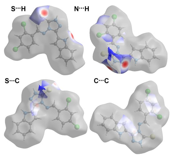 In addition, all S···H and N···H intermolecular contacts appeared in the corresponding decomposed fingerprint plots as two sharp pikes for each interaction. This observation revealed not only the significance of these two contacts in the molecular packing but also shed the light on the contribution of the molecular unit inside the surface in these interactions as hydrogen bond donor and acceptor. As expected, the N···H interactions appeared as sharper spikes indicating shorter interaction distances than the S···H contacts. The importance of these interactions in the molecular packing was also revealed from the appearance of these interactions as intense red regions in the corresponding decomposed dnorm maps (Figure 9).