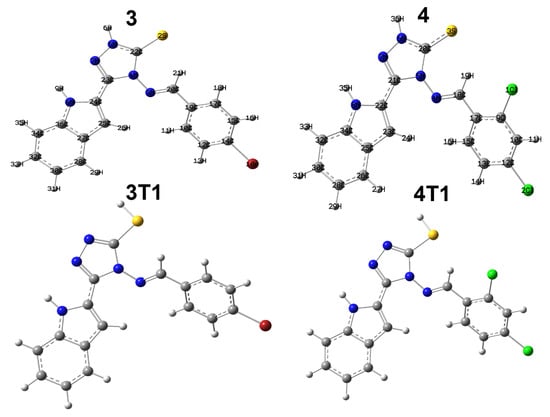 Our research group has been engaged in a research program about design, synthesis, and spectrophotometric investigations of a variety of heterocyclic systems have been recently reported [,,,,,]. In this context, we reported the synthesis of four different Schiff bases with the core structure of the indolyl-triazole-3-thione hybrid. The structure of the studied systems was confirmed using a set of spectrophotometric tools and the 3D structure of molecules 3 and 4 is further elucidated unambiguously by single crystal X-ray diffraction technique. Thione-thiol tautomerism was investigated using DFT calculations. In addition, Natural Bond Orbitals (NBO) and Hirshfeld surface analyses of the most stable tautomer were also discussed.
