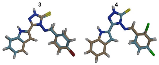 The capped stick model showing the different twists among the three connected ring systems (indole, triazole and aryl moieties) in 3 (higher) and 4 (lower).