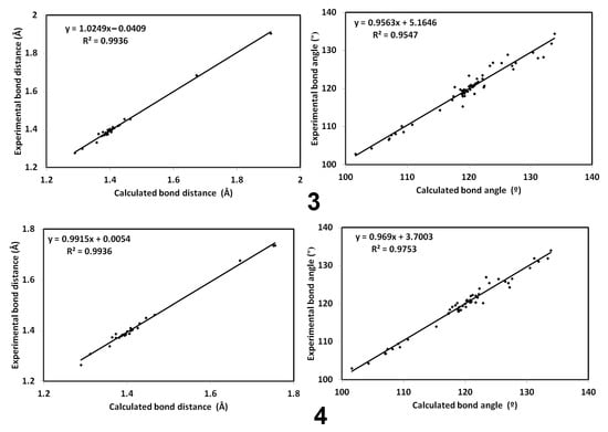 The calculated optimized structures of the most stable tautomer of 3 and 4 agreed very well with the reported X-ray structures as indicated from the excellent matching between them (Figure 11). The geometric parameters of the optimized structures are close to the experimental results with some little deviations in the bond distances and bond angles (Table S1 in Supplementary data). In addition, the deviations of the calculated bond distances from the experimental values are very small. For example, the largest deviations occurred for the C22–N5 and C20–N6 in compounds 3 and 4, respectively. The maximum errors in these cases are 0.027 and 0.019 Å, respectively. The corresponding percentage relative errors are 2.03 and 1.42%, respectively. These deviations could be attributed to the fact that the optimized structures belong to a single molecule in the gas phase which is free from the crystal packing effects. Generally, there are very good straight-line correlations with correlation coefficients (R2) of 0.994 and 0.968–0.990 for bond distances and angles, respectively (Figure 12).