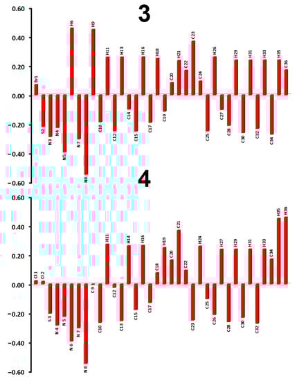 The studied systems comprised CHNSX (where X=Cl or Br) backbone and differ only in the substituent attached to the phenyl moiety. Graphical presentations of the natural charges at the different atomic sites are shown in Figure 13. The N and S atoms are electronegative where the NH nitrogen is the most electronegative in both compounds. The calculated natural charges at the amine nitrogen are almost the same for both compounds (−0.547 e). The other nitrogen atoms have smaller negative natural charges ranging from −0.225 to −0.303 e and −0.224 to −0.393 e for 3 and 4, respectively. In addition, the thione S-site has smaller negative natural charges than any of the nitrogen sites which are calculated to be −0.219 and 0.202 e for 3 and 4, respectively. In contrast, all hydrogen atoms are electropositive where the NH proton has the most positive natural charges. Their natural charge values are calculated to be 0.452 and 0.461 e for 3 and 4, respectively. On the other hand, the majority of carbon atoms have negative natural charges except those bonded to the N or S atoms where the most positive carbon is the one located between two nitrogen sites in the triazole moiety.