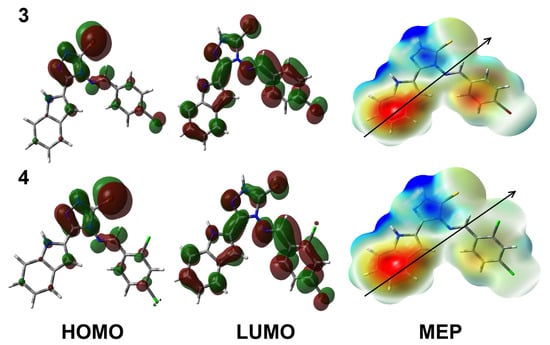 Both compounds are polar molecules with a net dipole moment of 2.430 and 3.348 Debye for 3 and 4, respectively. The compound with two chloro substituents at the phenyl ring (4) has higher polarity than the one with bromo substituent (3). The direction of the dipole moment vector is the same in both compounds as can be seen from Figure 14. In the same figure, the molecular electrostatic potential map (MEP), HOMO and LUMO levels were presented. In MEP map, there are red regions related to the atomic sites with high electron density while the blue regions are related to the atomic sites with the lowest electron density.