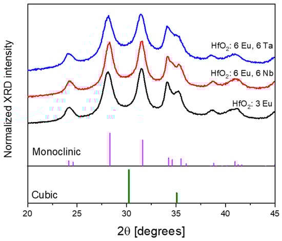 Figure 1 shows X-ray diffraction, recorded on 3 at.% Eu3+ HfO2; 6 at.% Eu3+ and 6 at.% Nd5+ HfO2; and 6 at.% Eu3+ and 6 at.% Ta5+ HfO2 nanopowder samples. The expected monoclinic structure is observed for the 3 at.% doped HfO2, as well as for the samples doped with 6 at.% of Eu3+ and charge compensated with either Ta5+ or Nb5+ showing nearly identical diffractograms, where we could not find traces of cubic phase. Besides identical crystal geometry, the samples show similar broadening of the diffraction peaks, indicating that the crystal size is little affected by the different kind and amount of dopants. In fact, the Scherrer analysis held on the (111) peak at 31.5 degrees led to quite similar values of the average crystal size for Eu doped and Eu/Nb co-doped particles, namely 8.1 and 8.5 ± 1.5 nm, respectively, while slightly smaller sizes of 7.3 ± 1.5 nm were obtained for for the Eu/Ta co-doped sample. These results are further supported by TEM investigations (see Figure S1 in the Supplementary Materials for representative micrographs of Eu/Nb co-doped HfO2) where nanocrystals with diameters ranging between 5 and 10 nm could be observed.