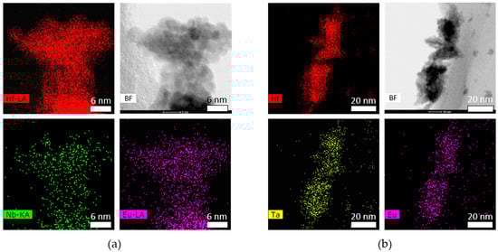 In absence of charge compensation, Eu-doped HfO2 shows an intense excitation band near 5.85 eV, which could be related to the host free exciton [12]. When charge compensation takes place, additional excitation bands appear, strongly depending on the nature of the co-dopant, demonstrating the equally effective incorporation of the pentavalent Ta and Nb ions into the lattice during the synthesis. Such excitation bands at around 260 nm and 230 nm measured for HfO2: 6 Eu, 6 Nb and HfO2: 6 Eu, 6 Ta, respectively, well agree with similar trends reported by Yin et al. [7] in ZrO2:Eu,Nb and ZrO2:Eu,Ta. Other works on similarly doped HfO2 by Wiatrowska et al. [12] observed similar features, which were interpreted as the O2− → M5+ (M = Ta and Nb) charge transfer transitions. Since the Eu3+ f-f emissions in the monoclinic site are effectively excited through such charge transfer states, we may infer that Eu3+ ions as well as Nb5+ and Ta5+ lie within the hafnia lattice in near proximity. EDX elemental analysis (Figure 2 and Figure S1) also supports this conclusion, showing the presence of both dopants in the same locations, i.e., within the hafnia particles and in the proportion expected based on the nominal composition set during the synthesis. All these results, point at the effective incorporation of the dopants through this synthetic route and to the strong association of activator ions and co-dopants at very close distance.