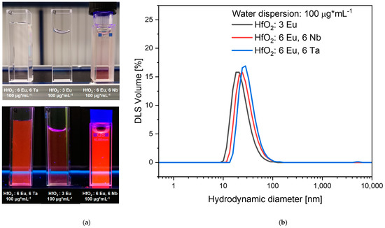 The following are available online at https://www.mdpi.com/article/10.3390/cryst11091042/s1, Figure S1: TEM micrographs of HfO2: 6 Eu, 6 Nb, Figure S2: EDX spectra of HfO2:6 Eu, 6 Nb and HfO2: 6 Eu, 6 Ta, Figure S3: Enlarged PL spectra showing the splitting of the 7F1 level of Eu3+, Figure S4: Optical characterization of the HfO2:6 Nb, 6 Eu water dispersion at different particle loadings.