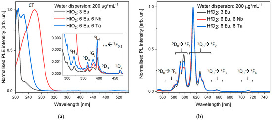 Photoluminescence excitation (PLE) spectra obtained monitoring the Eu3+ luminescence on particle dispersions are presented in Figure 4a, revealing the dominance of broad excitation bands located at wavelengths lower than 300 nm. The sharp intra-center excitation lines of Eu3+ occur between 300 and 465 nm (Figure 4a, inset). While these intra-center excitation are negligibly affected by the presence of co-dopants, and compatible with the expected intrinsic transitions of Eu3+ ions in hafnia, the high energy bands in the UVC spectral region are strongly affected by the charge compensation. Indeed, the main band at 205 nm of the Eu doped sample, is coupled to an additional band centered at around 225 nm in the Ta5+ doped sample. In the case of the nanocrystals co-doped with Nb5+, the PLE is dominated by a broad band at around 260 nm. However, these different excitation channels lead to the typical PL (Figure 4b) of Eu3+ ions in monoclinic HfO2, mostly unaltered by the co-dopants. The only observable difference is the minor change in the 5D0 → 7F1 transition (see Figure S3) where the charge compensated samples shows a stronger splitting of the energy sublevels which can be attributed to an increase in the strength of the crystal field [19,20].