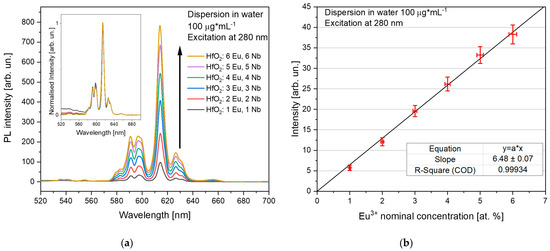 When rising the particle concentration in dispersion, a linear response of the PL intensity is observed up to a loading of 200 μg*mL−1 (Figure S4), as expected for low concentration regime of unperturbed systems. At higher particle concentration, detrimental scattering and absorption phenomena should be expected. Indeed, the recorded emission increases but deviates from the linear trend, likely due to the light diffusion and absorption of the incident beam, before it reaches the center of the sampling cuvette concequently reducing the detected intensity. This feature is of quite high importance, especially when considering that the PL output of the dispersion could be also increased by rising the doping level at constant particle loading. Indeed, when the nominal dopant concentration is increased, a higher PL output is observed (Figure 5a), as expected for a higher activator concentration. Additionally, the shape of the emission was not altered by variations in doping levels, as shown in the inset. However, it should be noted that the intensity of the HfO2: Eu, Nb emission increases linearly with the dopant content through the whole concentration range according to the PL integrals reported in Figure 5b (calculated in the spectral range between 515–745 nm).