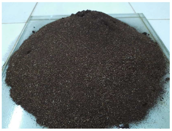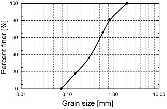 This study observed organic soil collected from Siak, Province of Riau, Indonesia. The organic soil samples were prepared following Canakci et al. [40]. All the samples were sieved, and the soil that passed through sieve no. 100 (0.15 mm) was used in this study, as depicted in Figure 1. Soil property tests were performed to observe the characteristics of the organic soil. The soil was categorized as organic clay (OH) by the Unified Soil Classification System (USCS) [41]. It had an organic content of 56.58%, a D10 of 0.11 mm, and a liquid limit of 126.25%. The grain size distribution and physical properties of the organic soil used in this study are shown in Figure 2 and Table 1, respectively. In addition, the treatment solution was prepared by mixing the reagent and the catalyst. The reagent was prepared by combining the urea and CaCl2 with 95% purity taken from Kanto Chemicals, Tokyo, Japan. Soybean flour with No. 1031P-BIOCert/LSO-006-IDN/05 /17, obtained from Gasol Pertanian Organik, was used as the biocatalyst in this study.
