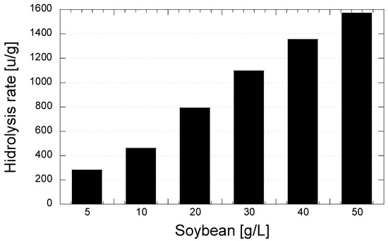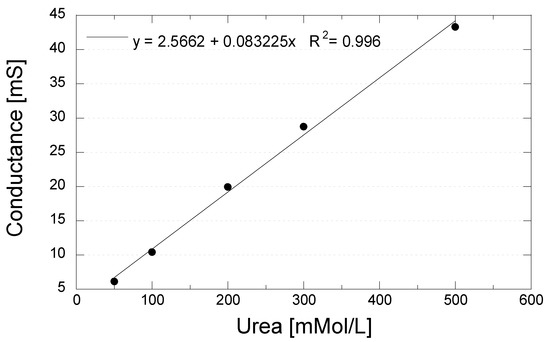 The conductance measurements were performed for various concentrations of soybeans, resulting in a linear curve with a slope. The slopes of the curves were then compared to the standard curve to obtain the hydrolysis rate depicted in Figure 5. As is apparent, the activity was linearly related to the increase in soybean concentration. The hydrolysis rate of 1600 u/g (note that 1 u of activity corresponds to 1 μmol/L of urea hydrolyzed per minute) was obtained using 50 g/L of soybeans. On average, the use of 1 g/L of soybeans was estimated to have an activity of around 40 u/g. Compared to commercial enzymes that have an activity of 2950 u/g for 15 g/L (or around 200 u/g for 1 g/L of urease) or other plant-derived ureases (i.e., watermelon [22], cabbage, soy pulp [27]), 5 g/L of soybeans is high enough to be used instead of commercial urease enzymes with the EICP method.