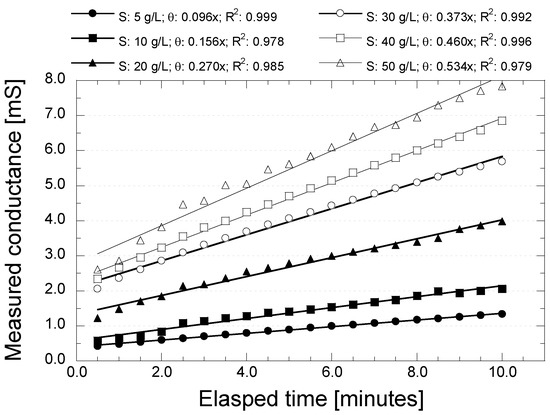 A hydrolysis rate analysis was conducted to evaluate the efficacy of soybeans in hydrolyzing urea. Various concentrations of urea, namely, 50, 100, 200, 300, and 500 mmol/L, were compounded with 15 g/L of soybeans. The evolution of the conductance was measured until all of the urea was hydrolyzed. This was indicated by the conductance reaching the maximum value. Next, the maximum conductance values were plotted to produce a standard curve for hydrolysis, as depicted in Figure 3. Then, 1 mol of urea was prepared and mixed with various concentrations of soybean powder of 5, 10, 20, 30, 40, and 50 g/L. The conductance measurements were performed for 10 min, and the results were plotted on a curve for the measured conductance. The change in conductance with time is shown in Figure 4.