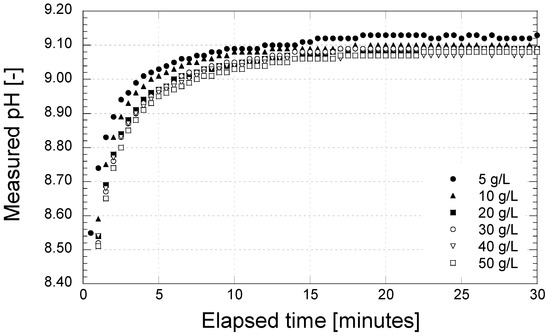 The results show a significant improvement in the pH value at the beginning of mixing. It reached a constant value after 30 min, in the range of 9.08 to 9.12, depending on the soybean concentration. The increasing pH indicates the change in urea to carbonate and ammonia ions by means of hydrolysis. The released ammonia (NH4) ions promoted the increase in pH [44]. Furthermore, the constant value of the pH confirms the completion of the reaction. The entire amount of urea was converted to carbonate and ammonia ions. The results of the pH measurements also show a decrease in the activity of the enzymes when the pH was 9 [45]. In addition, the pH results indicate that the concentration of soybeans had no significant impact on the pH. A relatively similar pH was obtained for the various concentrations of soybeans, ranging from 5 to 50 g/L, resulting in pH levels ranging from 9.08 to 9.12.