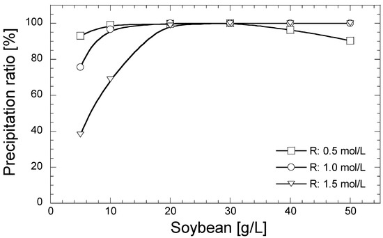 The productivity of the various concentrations of soybeans and reagents in producing a precipitated material is shown in Figure 7. The precipitation ratio significantly increased when the concentration of soybean was increased from 5 to 20 g/L. Then, the precipitation mass reached a stable condition even when the soybean concentrations were enhanced. The increase in soybean concentration was seen to promote an improvement in the hydrolysis rates, and thus, it enhanced the calcite mass. In addition, the various concentrations of the reagent resulted in a different trend in the calcite mass. The increasing reagent concentration brought about a lower precipitation ratio in the same soybean concentration. These results indicate that soybean concentration is a crucial parameter in this method. Hence, the optimum concentration of reagent and soybeans should be considered. The increase in the concentration of the reagent from 0.5 to 1.5 mol/L should be followed by the enhancement of the concentration of soybean from 5 to 30 g/L. Neupane et al. [19] noted that the upgrade in urease concentration had a notable influence on the precipitation ratio in the calcite precipitation method. Furthermore, this study shows that a high concentration of soybeans was able to inhibit the precipitation process. The precipitation ratio decreased from 90 to 95% when 40 to 50 g/L of soybeans were appended to the solution. The organic content may affect this phenomenon, resulting in undissolved soybeans, hampering the precipitation process. Hence, a method to isolate the undissolved soybeans should be considered in order to optimize the use of soybeans as a bio-catalyst.