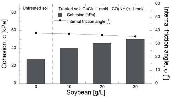 The results of the DS tests on the organic soil treated by the calcite precipitation solution with various soybean concentrations are depicted in Figure 8. The results show that the cohesion levels of the improved soil were augmented significantly. Improvements in cohesion, ranging from 43 to 79% compared to the untreated soil, were obtained for the various soybean concentrations. Increasing the soybean concentration also led to an improvement in cohesion. The treatment solution composed of the reagent and soybeans was able to promote calcite precipitation and the strengthening of the soil particles. In comparison, the improvement in the strength gained in this research was significantly higher than that in bacterial-based calcite precipitation techniques [36,38]. The results confirm that the application of soybeans might be more effective than bacteria. This could be due to the activity of susceptible bacteria and influenced by environmental conditions [46]. In addition, it was shown that a lower pH hampered the bacterial activity, thus reducing the hydrolysis process [47].
