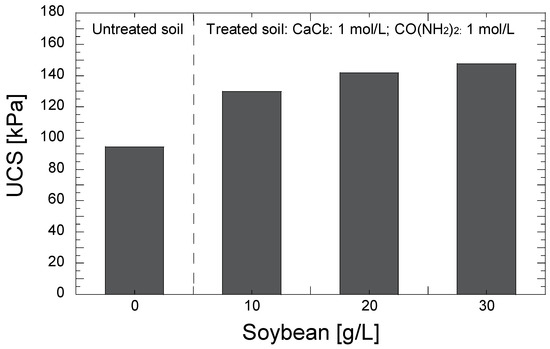 Samples for the UCS tests were set up and treated in a similar way to the DS tests. The augmentation of the organic soil’s compressive strength at various soybean concentrations is depicted in Figure 9. The results show that applying the calcite precipitation technique resulted in a significant improvement in the UCS. Strength ranging from 130 to 148 kPa or a gain of 37 to 58% was obtained in this research compared to the untreated soil. The variation in soybean concentration also promoted a slight increase in the UCS. The rise in the strength of soil observed in this research was relatively lower than that of sandy soil. Putra et al. [24] reported that using a grouting solution composed of 2 g/L of the urease enzyme and 1 mol/L of the reagent resulted in an improvement in the strength of 205 kPa. This lower improvement in strength may cause a lower pH of 3 to 4 and organic content in the soil sample. Stocks-Fischer et al. [51] reported that the optimum pH for calcite promotion in calcite precipitation is 8.3 to 9.0. Previous studies also reported that a pH of 7.0 is the optimum condition for precipitated calcite [23]. In addition, the presence of the organic content coming from the soil sample and the undissolved soybeans may hamper the precipitation process; thus, the production of calcite is limited [27]. The results of the DS tests show a similar trend to that of the UCS tests conducted in this research. The UCS improvement also demonstrates an increase in cohesion. These results confirm that the precipitated calcite enhanced the cohesion of the soil particles [52].