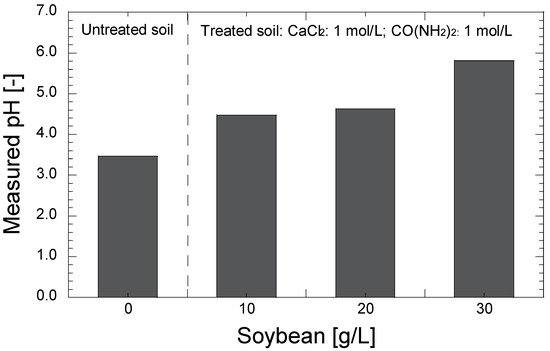 The pH measurement results are presented in Figure 10. The untreated organic soil was highly acidic, with a pH of 3.4. The soil treatment resulted in a slight improvement in pH with a maximum pH of 5.9. The lower improvement in pH may have been due to the fact that the precipitated solution was a weak base material with a maximum pH of 9, whereas the soil sample was strongly acidic [51]. This condition may also have had a significant effect on the precipitation process. A lower pH during the treatment process may have inhibited the hydrolysis process and thus, hampered calcite formation and reduced the calcite content [51].