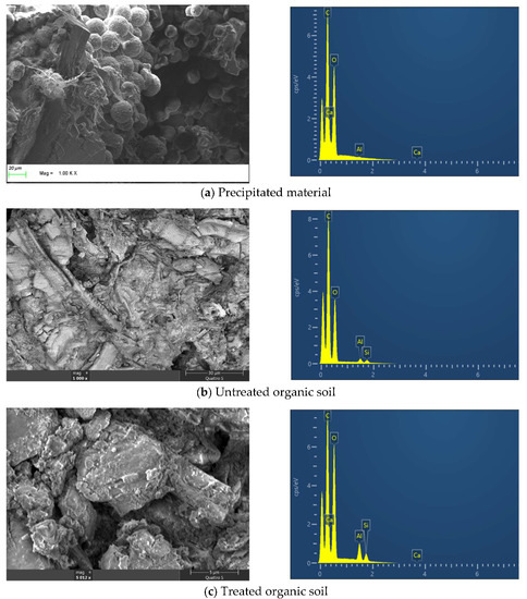 The EDS results show that the precipitated material and organic soil had carbon, oxygen, and aluminum. In addition, the precipitated material was also composed of calcium. Meanwhile, the organic soil had silica. Figure 11b shows the SEM-EDS results for the unimproved organic soil. The sheet and form of the fiber were both clearly observed in the soil sample. Furthermore, Figure 11c shows the SEM-EDS results for the treated organic soil. The SEM tests were performed with a magnitude of 5000 times. The precipitated calcium carbonate was seen to be covering the sheet of organic soil. It filled the pores, bound soil particles, and thus increased the organic soil’s strength. The SEM image clearly shows that the crystals precipitated on the organic soil’s surface. However, the precipitated materials promoted in the treated were dominated by the amorphous form. It may also have impacted the presence of the organic content, resulting in soil samples and undissolved soybeans. The rhombohedral and spherical shape of the precipitated materials may have had difficulty forming in the high content of organic materials. The precipitated form and its location may have caused the lower effectivity of the improvement in the organic soil compared to that in the sandy soil, where the precipitated material ideally formed as calcite in the rhombohedral form on the contact surface of the soil particles [40]. Canacki et al. [40] also reported that in the organic soil treatment by the calcite precipitation method, the precipitated material formed on the surface and filled the pores of the organic soil.