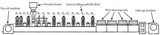 The preparation technology for seamed flux-cored filler metal [17] mainly applies the cold-rolled metal strip method or the coil method. The cold-rolled metal strip method is commonly used worldwide and can be achieved by either tandem rolling or rolling–drawing. The tandem rolling method is relatively simple, with the processes of pay off, U-shaping, powder feeding, closing and rolling reduction all completed continuously on one production line. As this occurs, the material quality and installation accuracy of the rolls are strictly controlled. As for the rolling–drawing method (as shown in Figure 3), the diameter-reduction process is changed from rolling to drawing, and the processes are completed using different equipment (rolling mills, drawing machines). In recent years, with the emergence of new high-speed wire drawing machines and polymerized crystal diamond (PCD) drawing dies, the drawing process has become simple. The rolling–drawing method thus presents a promising opportunity to further improve the production efficiency and surface quality of flux-cored filler metal. Researchers from Zhengzhou Research Institute of Mechanical Engineering created flux-cored silver filler metal with a spiral seam structure (Figure 2c) [18], prepared via the strip rolling method [16]. The ribbon-shaped silver-based filler metal with internal surface roughening is rotated and rolled into a spiral tubular structure with lap joints. During the rolling process, brazing flux is added to the spiral tube, and then the diameter is reduced by drawing or rolling to prepare the flux-cored filler metal at a specified size. This technology can add flux efficiently and conveniently at a low cost. In addition, it is easy to achieve automatic production, which is fitting for the popularization and application of an automatic brazing process. Chen et al. [19,20] successfully prepared brittle Φ 2.0 mm Al–10Si–10Cu flux-cored brazing wire using the rolling method. Shanghai Longshuo Welding Materials Co., Ltd. [21] used a cold-rolled composite strip (4045 aluminum alloy/Cu/4045 aluminum alloy) to prepare a brazing filler metal, which solved the difficult problem of brittle flux-cored filler metal processing. The coiling method, however, was first developed by Lincoln Electric Co. (USA) for the production of flux-cored welding wire. This technology splits the cylindrical solid welding rod into two halves from the center. The coiling method has fewer cold-rolling passes and requires no intermediate annealing [17]. However, the coiling method is not suitable for the production of flux-cored filler metal with a fine diameter (≤2.0 mm) in terms of efficiency, cost or quality stability. As a result, this technology is rarely used to prepare flux-cored filler metals.