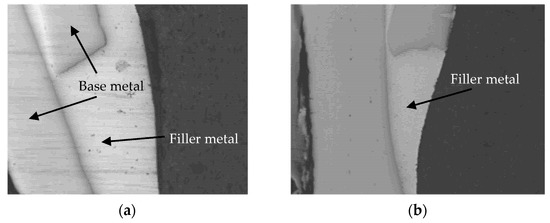 Comparison of brazed joints with different kinds of brazing filler metal [68]: (a) solid silver filler metal; (b) flux-cored silver filler metal.
